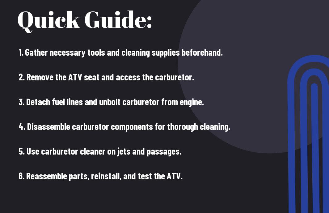 Most ATV enthusiasts will agree that a clean carburetor is crucial for optimal performance. In this guide, you’ll learn how to effectively clean your ATV’s carburetor step-by-step, ensuring that your vehicle runs smoothly and efficiently. You’ll discover the tools needed and the techniques to tackle this maintenance task with confidence. For additional insights, check out this informative link on How to clean a carb. Let’s get started!